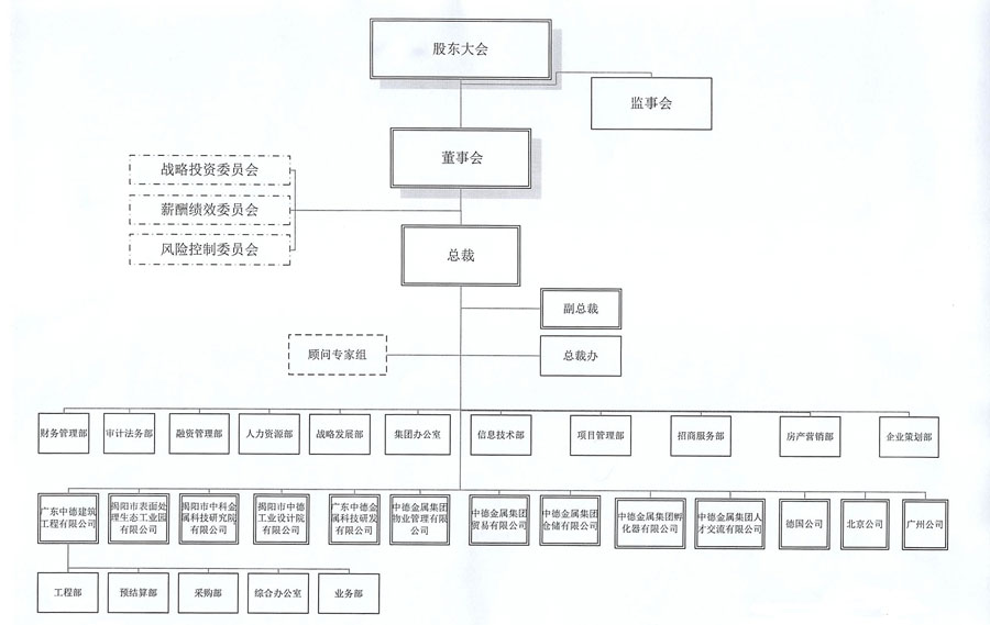 中德金屬集團(tuán)按“三會(huì)一層”的管理思想,組建了職能完善、結(jié)構(gòu)清晰的組織架構(gòu)。在經(jīng)營(yíng)層面,以總裁為核心,成立了集團(tuán)辦公室、戰(zhàn)略發(fā)展部、人力資源部、融資管理部、審計(jì)法務(wù)部、財(cái)務(wù)管理部、信息技術(shù)部、項(xiàng)目管理部、招商服務(wù)部、房產(chǎn)營(yíng)銷部、企業(yè)策劃部等十一個(gè)核心職能部門。同時(shí),下轄十三家子公司。