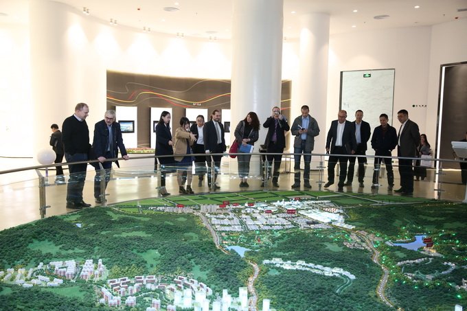 弗朗西斯科•查洛佩斯基一行參觀園區(qū)沙盤,了解項目整體規(guī)劃及與德合作成效