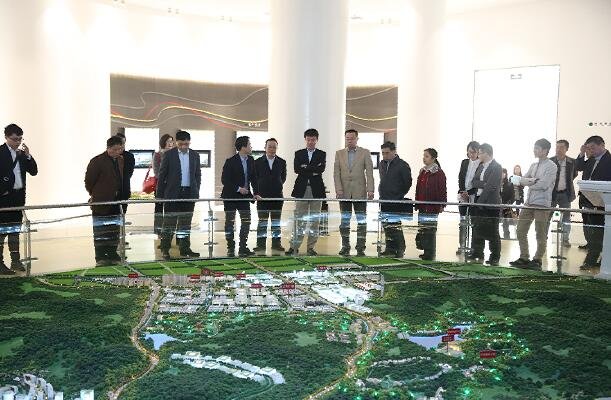 張建國(中)參觀園區(qū)沙盤,了解項(xiàng)目規(guī)劃布局及產(chǎn)業(yè)創(chuàng)新相關(guān)情況,