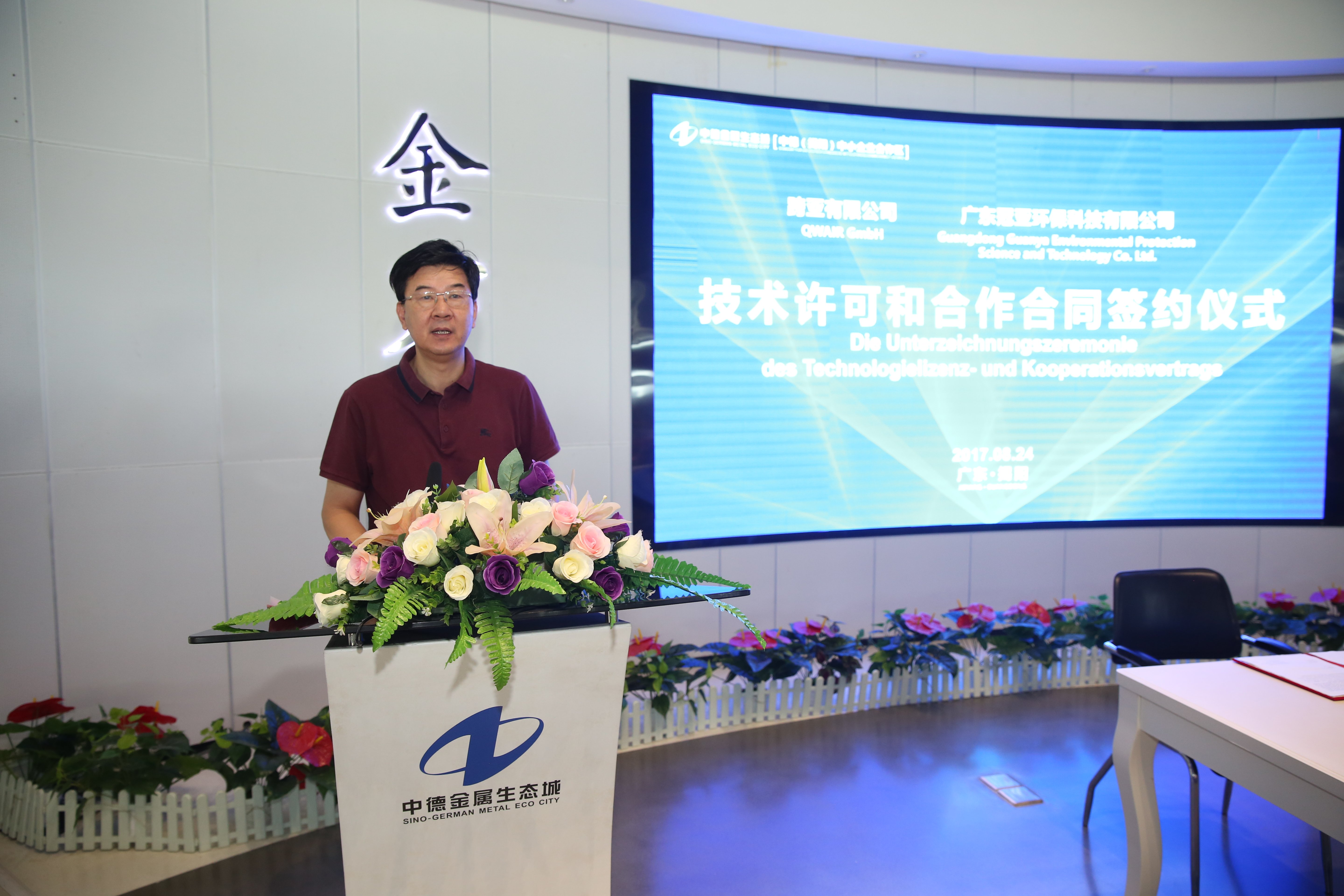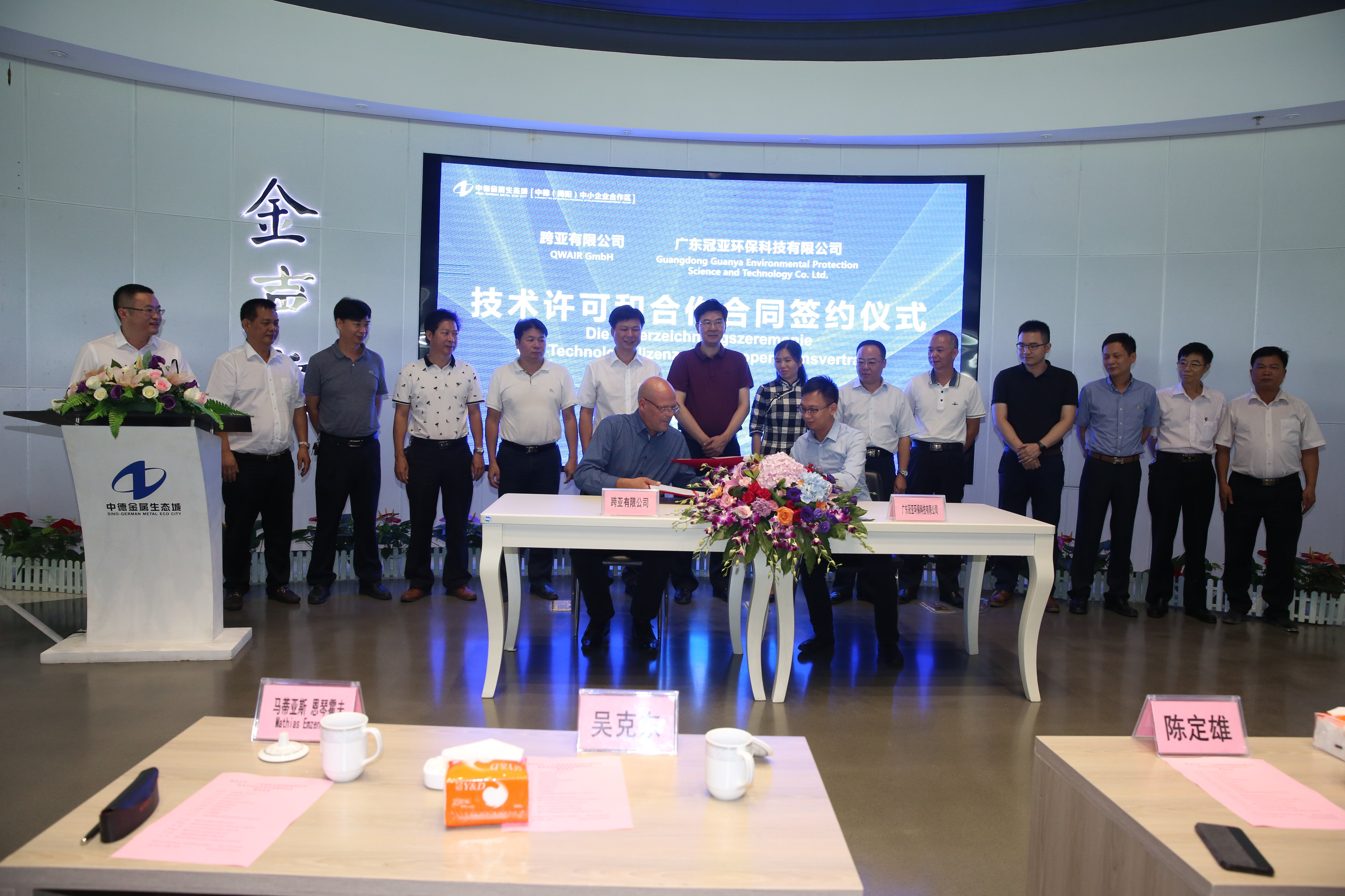 廣東冠亞環(huán)?萍加邢薰境闪⒂2016年,是一家主攻污水處理的創(chuàng)新型環(huán)?萍脊。德國(guó)跨亞有限公司專注于為水、空氣和能源領(lǐng)域提供工程設(shè)計(jì)、咨詢服務(wù)和技術(shù)許可,擁有以蒸發(fā)和冷凝為基礎(chǔ)的跨亞 Waterwin技術(shù)。經(jīng)過(guò)中德金屬集團(tuán)的牽橋搭線,雙方經(jīng)過(guò)六周的激烈談判與技術(shù)測(cè)試,最終決定在中德金屬生態(tài)城進(jìn)行深入的項(xiàng)目合作?鐏 Waterwin技術(shù)是電鍍“零排放”第二代的新處理工藝,這項(xiàng)技術(shù)將對(duì)重金屬和高污染工業(yè)污水的傳統(tǒng)處理工藝帶來(lái)顛覆性的改變,將大幅降低水處理的成本。根據(jù)合同,此次專利技術(shù)轉(zhuǎn)讓是德國(guó)跨亞公司授予廣東冠亞公司在中國(guó)的“獨(dú)占性許可”,雙方將在中德金屬生態(tài)城電鍍一期濃廢液處理項(xiàng)目進(jìn)行項(xiàng)目應(yīng)用。未來(lái)五年內(nèi)將以中德金屬生態(tài)城電鍍“零排放”二期為依托,打造第二代“零排放”污水處理的典范項(xiàng)目,并向全國(guó)復(fù)制推廣,項(xiàng)目產(chǎn)值預(yù)計(jì)將達(dá)到50多億元人民幣。