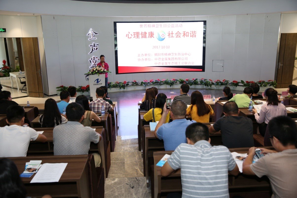 為引起社會(huì)對(duì)精神衛(wèi)生問題的關(guān)注,讓職工對(duì)慢性病防治知識(shí)有所了解,提高職工的健康水平,10月10日上午,由揭陽市慢性病防治院主辦,中德金屬集團(tuán)有限公司及中德金屬生態(tài)城工會(huì)聯(lián)合會(huì)協(xié)辦的“心理健康•社會(huì)和諧”健康講座在中德金屬生態(tài)城四大中心金聲堂舉行。市慢性病防治院院長(zhǎng)張梓揚(yáng)等參加活動(dòng)。來自中德金屬集團(tuán)辦公室、房產(chǎn)營銷部、項(xiàng)目管理部、信息技術(shù)部及表處園、建筑公司、物業(yè)公司、研究院等集團(tuán)子公司80多人到場(chǎng)聆聽。