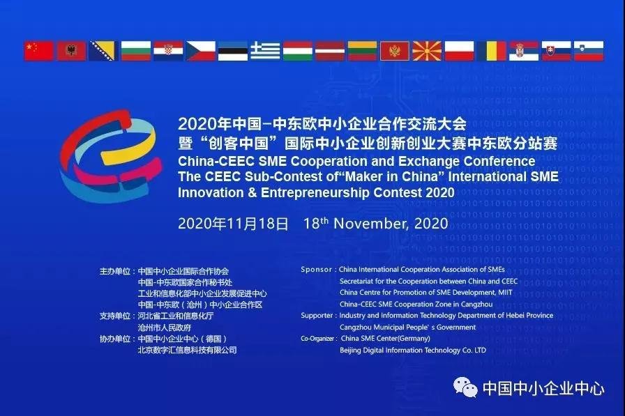 11月18日,由中國-中東歐國家合作秘書處、中國中小企業(yè)國際合作協會、工業(yè)和信息化部中小企業(yè)發(fā)展促進中心及中國-中東歐(滄州)中小企業(yè)合作區(qū)共同主辦的“創(chuàng)客中國”國際中小企業(yè)創(chuàng)新創(chuàng)業(yè)大賽中東歐分站賽線上決賽暨中國-中東歐中小企業(yè)線上對洽會在北京隆重召開。中國中小企業(yè)中心(德國)是本次會議的協辦單位。