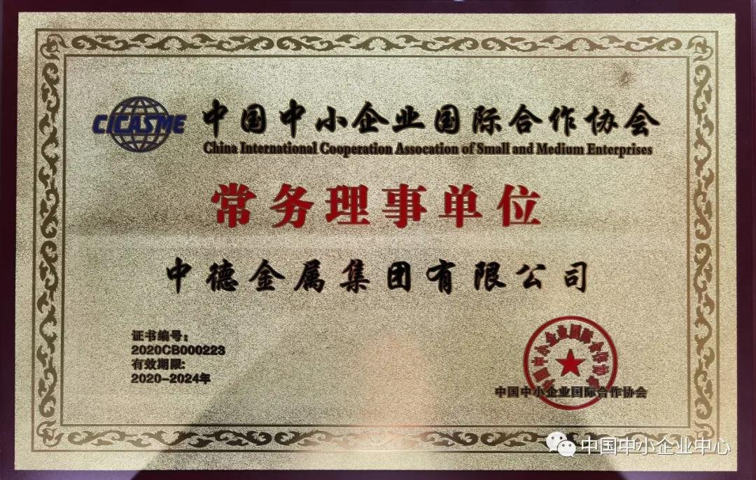 憑借在助推中小企業(yè)對外合作和創(chuàng)新發(fā)展方面的不懈努力和突出成績,中德金屬集團獲選中國中小企業(yè)國際合作協(xié)會常務(wù)理事單位,這是國家級行業(yè)協(xié)會對中德金屬集團服務(wù)中歐中小企業(yè)雙向合作工作的高度認可,也是對集團在中小企業(yè)創(chuàng)新發(fā)展工作中突出貢獻的充分肯定,意味著中德金屬集團將更好地為國內(nèi)中小企業(yè)提供更大的合作平臺和海內(nèi)外資源。