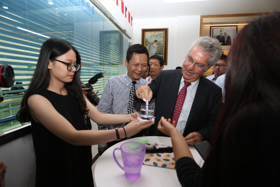 △來揭出席中奧企業(yè)合作洽談會的奧中友協主席、奧地利共和國前總統海因茨•菲舍爾考察大宇環(huán)保公司,體驗水凈化筆的凈水過程
