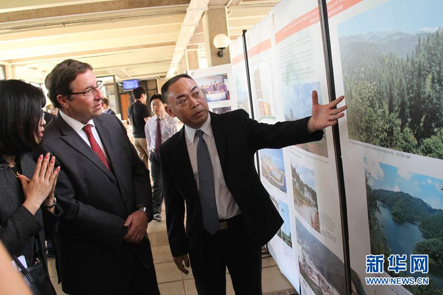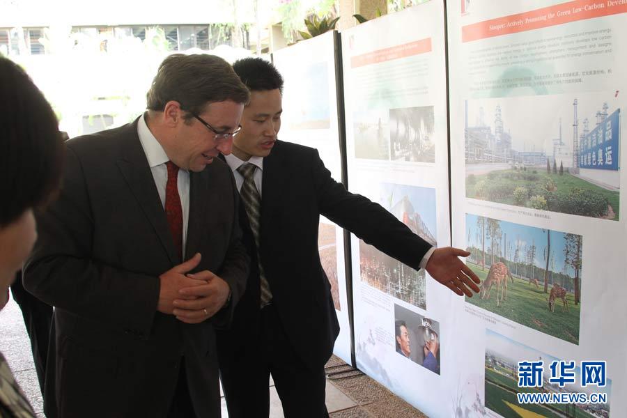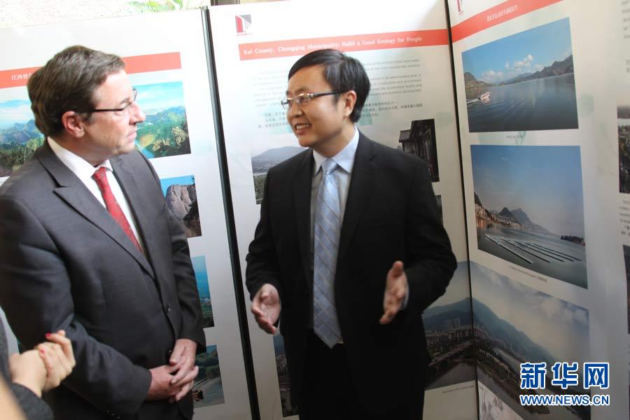 廣東省揭陽市副市長陳澄民(左)向聯(lián)合國副秘書長施泰納介紹揭陽市環(huán)保圖片。5月20日,“明月行動(dòng).綠色中國夢(mèng)”大型環(huán)保公益活動(dòng)中國環(huán)保圖片展在肯尼亞首都內(nèi)羅畢聯(lián)合國環(huán)境規(guī)劃署新華影廊舉行,展示中國地方政府和大型國資企業(yè)與知名企業(yè)關(guān)注環(huán)保、力行環(huán)保、堅(jiān)持環(huán)保的上百張圖片,廣東省揭陽市政府、中國石化集團(tuán)、西安浐灞生態(tài)區(qū)和加多寶集團(tuán)昆侖山礦泉水公司等代表在展覽中向聯(lián)合國官員及來賓介紹生態(tài)環(huán)保成就。汪勇基攝