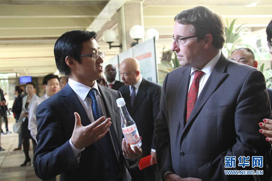 加多寶集團(tuán)昆侖山礦泉水公司負(fù)責(zé)人彭群國(左)在向聯(lián)合國副秘書長施泰納介紹昆侖山礦泉水產(chǎn)地與質(zhì)量情況。汪勇基攝