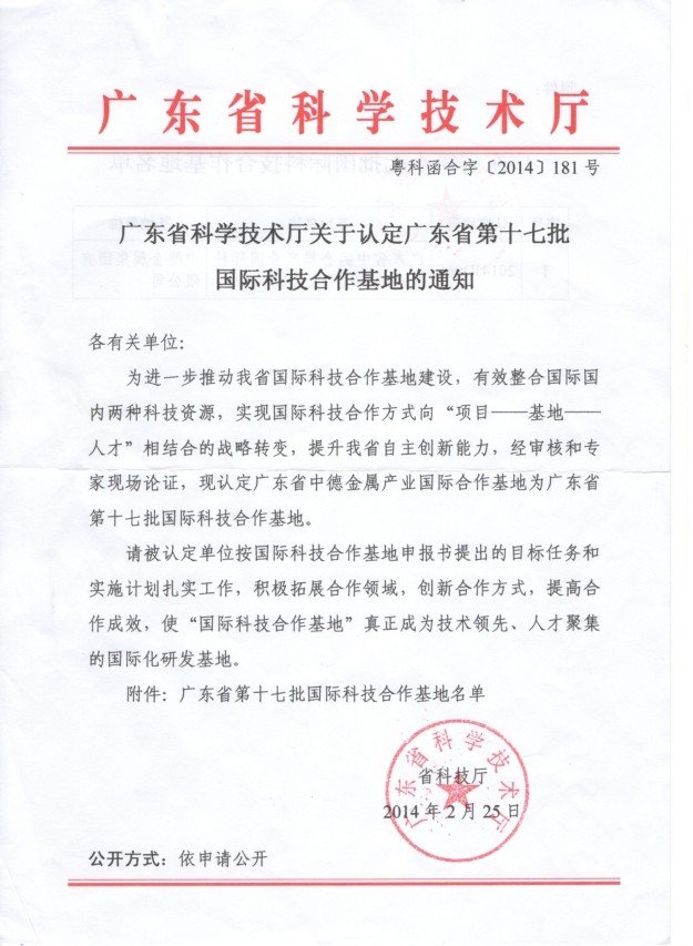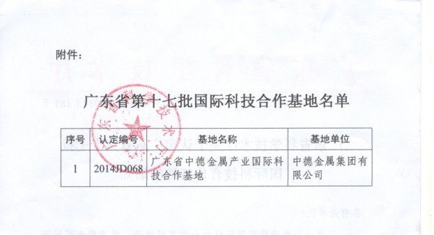 近日,中德金屬產(chǎn)業(yè)國(guó)際合作基地被廣東省科學(xué)技術(shù)廳認(rèn)定為廣東省第十七批國(guó)際科技合作基地,標(biāo)志著中德金屬集團(tuán)有限公司在整合國(guó)內(nèi)外科技資源、引進(jìn)專業(yè)技術(shù)人才、提升自主創(chuàng)新能力等方面獲得省級(jí)認(rèn)可及重點(diǎn)支持,這將進(jìn)一步加快基地高新企業(yè)集聚,助推中德合作、綠色發(fā)展更上新臺(tái)階。