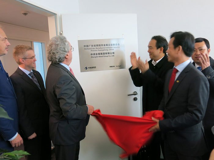 代表團(tuán)成員與斯泰格爾先生、迪特•洪德博士、迪克先生為中德金屬集團(tuán)德國子公司總部揭牌