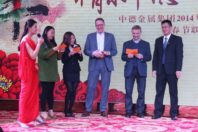 駿馬騰飛成壯舉,靈羊起步赴新程。2015年2月12日,中德金屬集團(tuán)在榕江大酒店舉辦了以“情系中德·執(zhí)夢(mèng)遠(yuǎn)航”為主題的2014年度總結(jié)表彰大會(huì)暨春節(jié)聯(lián)歡晚會(huì)。德國歐綠保集團(tuán)董事會(huì)成員、集團(tuán)COO、綠色燃料合資公司董事馬丁·貝克雷特曼(Martin Becker-Rethmann)、艾薩醫(yī)療技術(shù)公司總經(jīng)理邵愛民等外國嘉賓應(yīng)邀參加此次盛會(huì),與集團(tuán)領(lǐng)導(dǎo)以及全體公司員工共度了一個(gè)難忘而美好的夜晚。