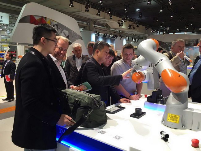 KUKA 公司設(shè)計的自主移動機器人,既可作為工業(yè)生產(chǎn)助手,也可作為家務(wù)助手,成為考察團的一大看點