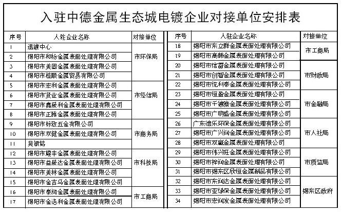 為貫徹落實全市電鍍產(chǎn)業(yè)發(fā)展推進會會議精神,全力加快中德金屬生態(tài)城電鍍園區(qū)建設,努力打造綠色電鍍產(chǎn)業(yè)高地,全市各地各部門主動作為,加強協(xié)調,形成合力,結對支持,切實幫助入駐園區(qū)電鍍企業(yè)解決投產(chǎn)建設過程碰到的各項問題,助推企業(yè)盡早投產(chǎn)運營。根據(jù)安排,市環(huán)保、經(jīng)信、商務等部門和揭東區(qū)政府等十家單位將對首批34家入園電鍍企業(yè)進行結對支持。